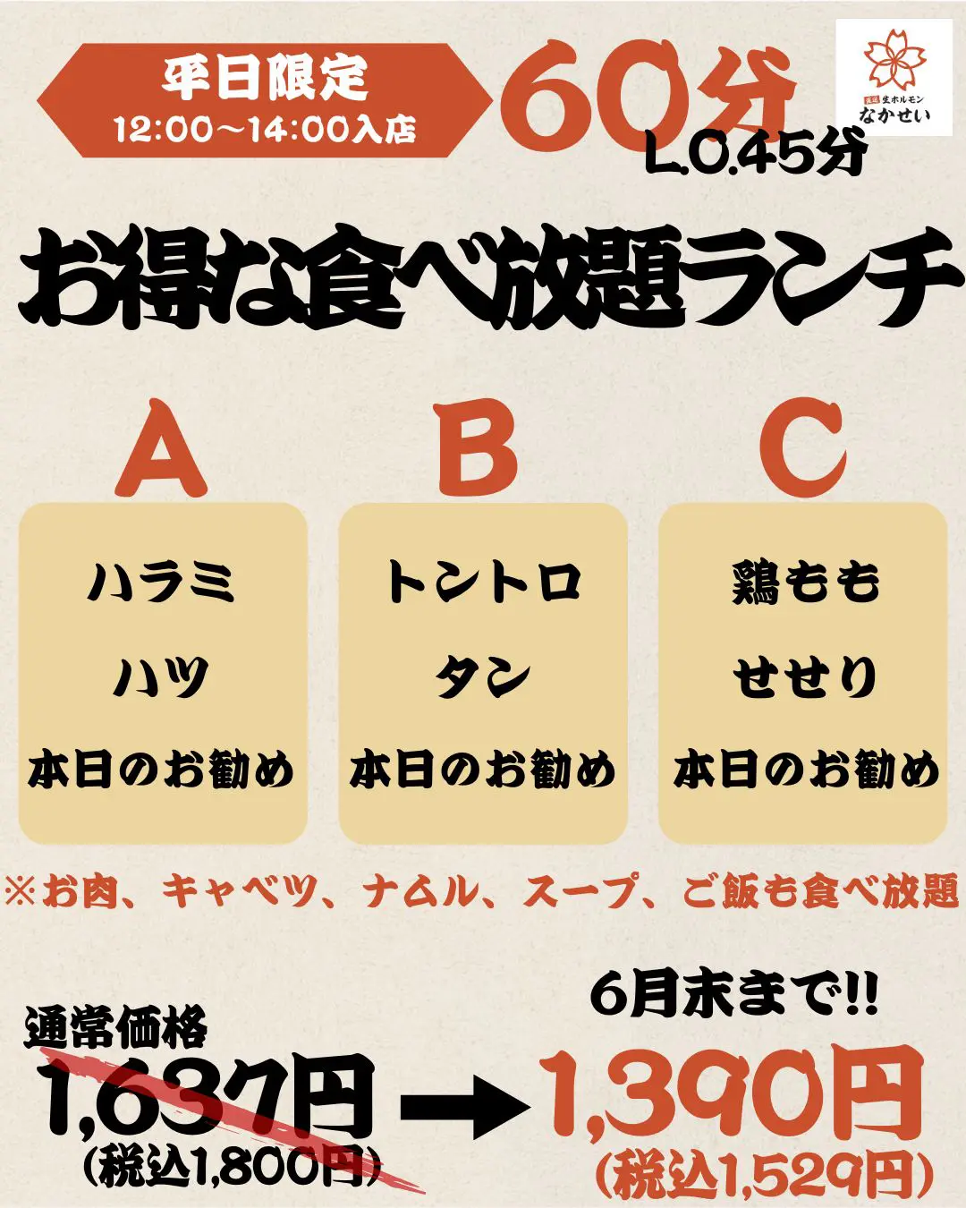 お昼からお腹いっぱいお肉を楽しめる大変お得なプランとなっております。